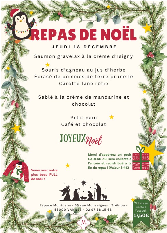 Le prochain repas de Noël aura lieu le jeudi 18 décembre à midi.